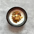 お好みの大きさに切ったドライりんごとグラノーラをヨーグルトにトッピングしました。色々な食感を楽しめるので少ない量でも満足できます。