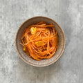 千切りにした人参とお好みの大きさに切ったマンゴーをオリーブオイル、塩、黒胡椒とあえるだけです。ワインやシャンパンのおつまみにおススメです。
